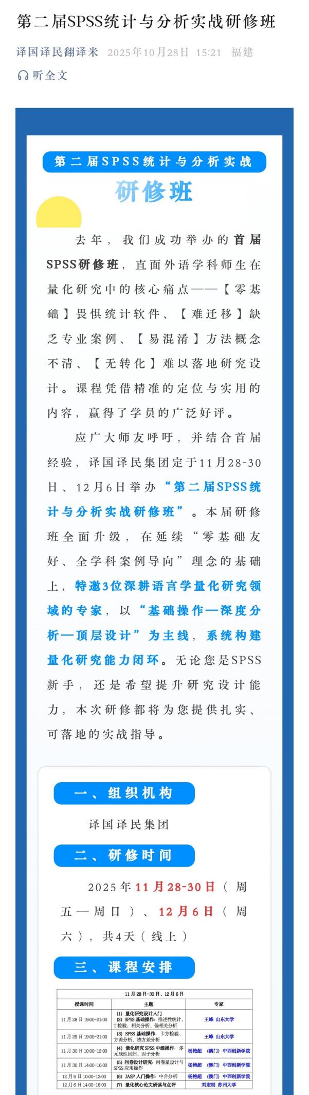 SPSS作为一款广泛应用于数据挖掘与量化研究的专业统计分析工具,在自然科学、社会科学与技术科学等多个学科领域发挥着重要作用。该软件集成了全面且强大的高级统计功能与机器学习算法,支持文本分析、大数据集成及开源扩展,操作便捷、结果直观,能够有效弥合数据科学与实际应用之间的鸿沟,助力研究者高效实现从数据到洞察的跨越。为系统提升我院教师在语言学及其他相关领域的量化研究能力,学院拟于2025年11月28–30日及12月6日举办“第二届SPSS统计与分析实战研修班”。本次研修班采取线上研修的方式,在延续“零基础友好、全学科案例导向”理念的基础上,特邀三位在语言学量化研究领域具有丰富实践经验的专家担任主讲,围绕“基础操作—深度分析—研究设计”三大模块展开,旨在系统构建参训教师的量化研究能力闭环。无论您是SPSS的初学者,还是希望进一步优化研究设计、提升数据分析深度的教师,本次研修都将提供贴近实战、易于落地的系统指导。现将研修安排通知如下。