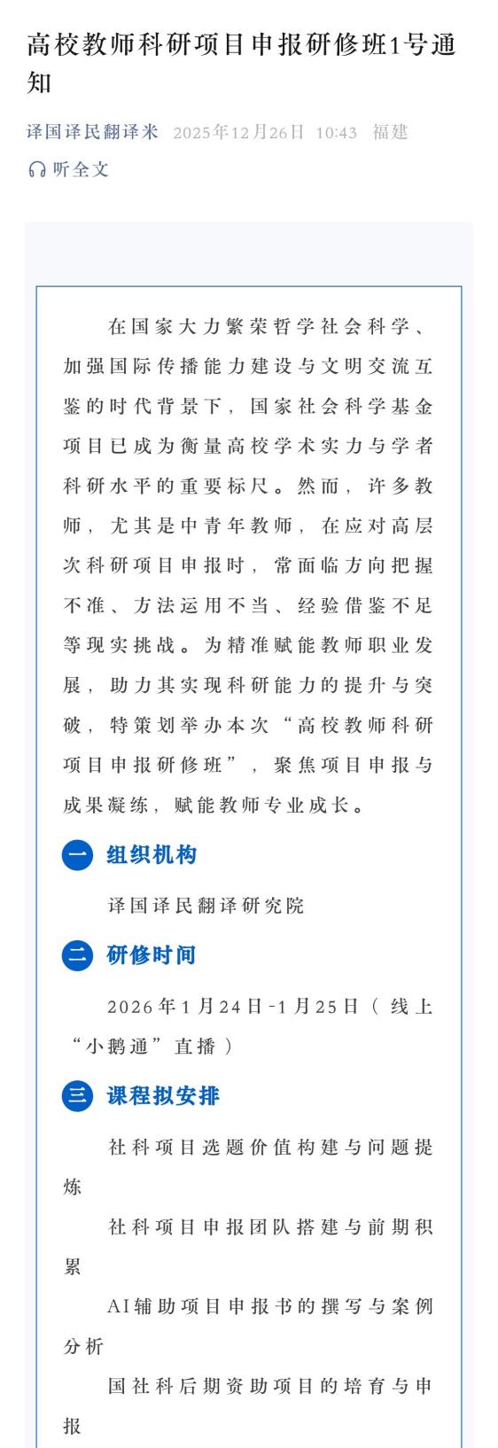 在国家大力繁荣哲学社会科学、加强国际传播能力建设与文明交流互鉴的时代背景下,国家社会科学基金项目已成为衡量高校学术实力与学者科研水平的重要标尺。然而,许多教师,尤其是中青年教师,在应对高层次科研项目申报时,常面临方向把握不准、方法运用不当、经验借鉴不足等现实挑战。为精准赋能教师职业发展,助力其实现科研能力的提升与突破,学院拟于2026年1月24日-25日举办“高校教师科研项目申报班”,聚焦项目申报与成果凝练,赋能教师专业成长。本次研修班采取线上研修的方式,现将研修安排通知如下。