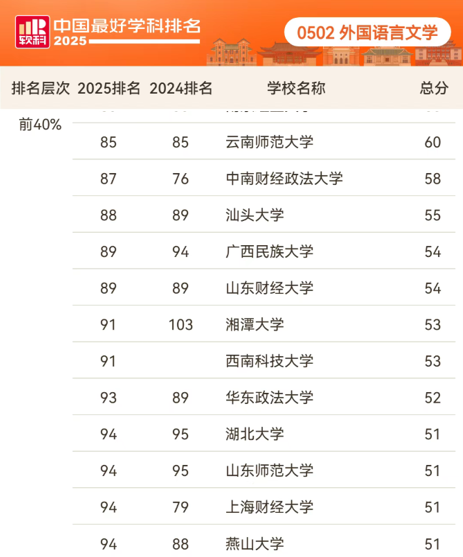近日,高等教育评价专业机构软科正式发布“2025软科中国最好学科排名”。在外国语言文学学科排名中,共有120所高校上榜。燕山大学外国语言文学学科凭借持续强劲的学科实力,再次跻身本学科前40%。自2022年首次跻身该区间以来,燕山大学外国语言文学学科已连续四年进入百强(河北省唯一),彰显了深厚扎实的学科基础与持续向上的发展韧性。