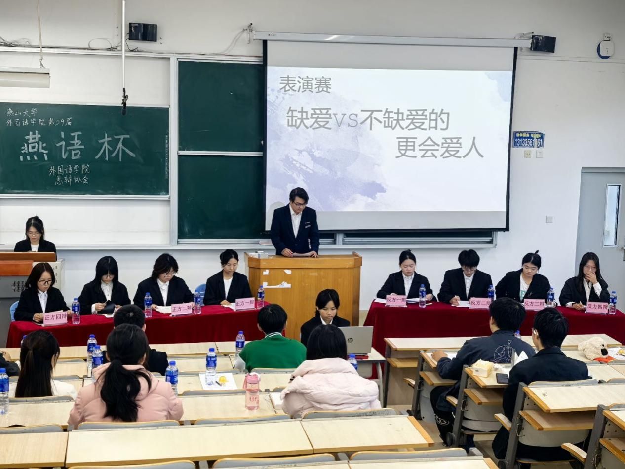 金秋十月,丹桂飘香。2025年10月11日,由外国语学院思辨协会主办的“燕语杯”辩论赛在四教209教室拉开帷幕。本次赛事以拓宽学生视野为宗旨,致力于引导2025级新生领略辩论的基本框架与独特魅力,激发大家对思辨艺术的兴趣与热情。赛事历经初赛、四强赛、半决赛等多轮激烈角逐,吸引了众多新生踊跃参与。最终,在10月31日迎来了激动人心的决赛。