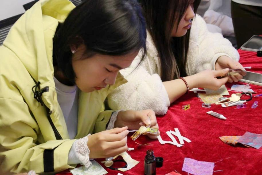 实践体验环节,同学们在工作人员的指导下,从挑选宋锦图案、法式香薰到粘贴制作,完成独属于自己的非遗宋锦发夹,深刻体会非遗技艺的精妙和法式浪漫的魅力。