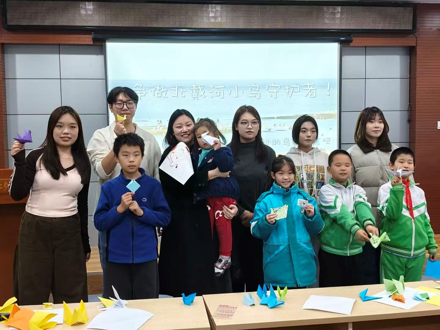 手工课堂环节成为活动亮点。志愿者们耐心指导孩子们用环保原木浆纸折制候鸟,孩子们发挥创意,将北戴河潮间带的靛蓝、晚霞粉、苇叶绿等自然色彩精心绘于“羽翼”之上。活动共完成60只折纸候鸟,其中18只由孩子们带回家中,成为生态文明教育的“流动载体”;剩余42只将入驻人文馆为期两周的“候鸟守护者微型展览”,后续还将移交秦皇岛市鸟类博物馆陈列,让孩子们的守护心意持续传递。活动尾声,孩子们高举折好的“候鸟”,与志愿者们共同定格“人鸟共生”的创意合影,将环保理念与美好回忆一同定格在童年时光。