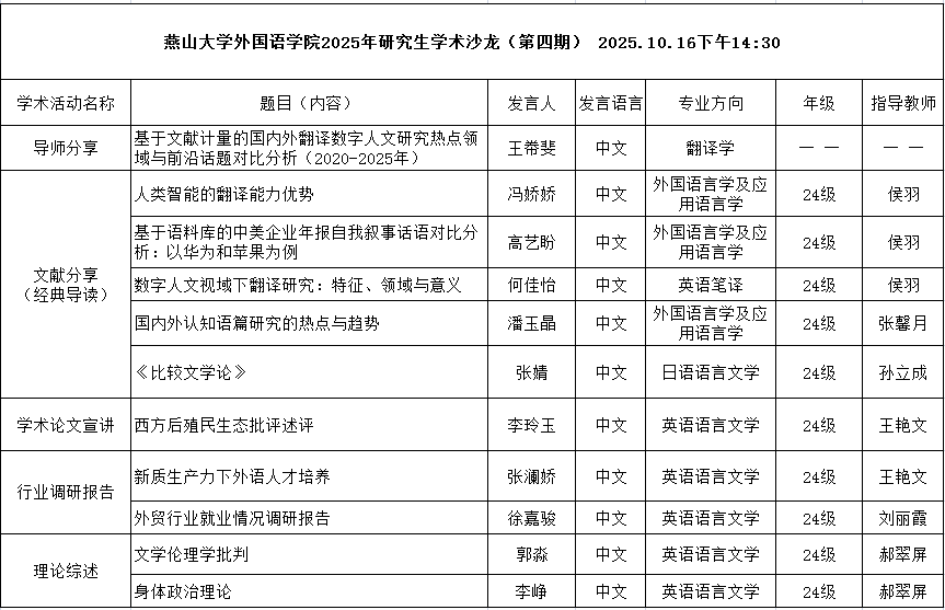 为促进我院研究生学术交流,活跃学术氛围,拓宽学术视野,激励学术创新,我院本年度将继续开展硕士研究生学术沙龙系列活动,沙龙包括“导师分享”、“文献分享(经典导读)”、“学术论文宣讲”、“行业调研报告”、“技术方法推荐”、“理论综述”等六大模块,每期10-12人汇报,采用主题宣讲和师生互动形式进行。现将2025年第四期活动安排公布如下。欢迎各位导师和同学踊跃参加。