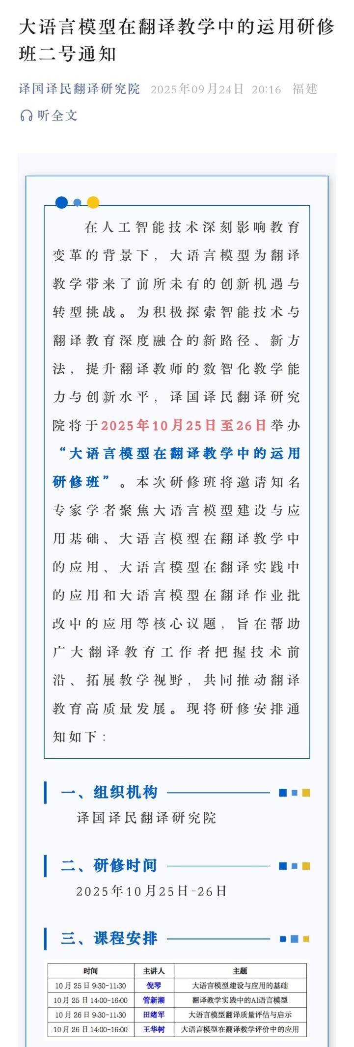具体信息链接:大语言模型在翻译教学中的运用研修班二号通知https://mp.weixin.qq.com/s/SN-06J6M9gMLq_vzzCa2Aw