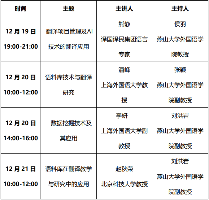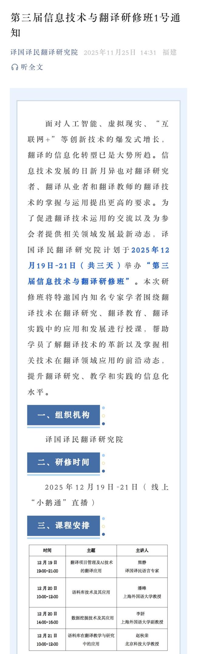 面对人工智能、虚拟现实、“互联网+”等创新技术的爆发式增长,翻译的信息化转型已是大势所趋。信息技术发展的日新月异也对翻译研究者、翻译从业者和翻译教师的翻译技术的掌握与运用提出更高的要求。为了促进翻译技术运用的交流以及为我院教师提供相关领域发展最新动态,学院拟于2025年12月19日-21日举办“第三届信息技术与翻译研修班”。本次研修班采取线上研修的方式,特邀国内知名专家学者围绕翻译技术在翻译研究、翻译教育、翻译实践中的应用和发展进行授课,帮助教师们了解翻译技术的革新以及掌握相关技术在翻译领域应用的前沿动态提升翻译研究、教学和实践的信息化水平。现将研修安排通知如下。