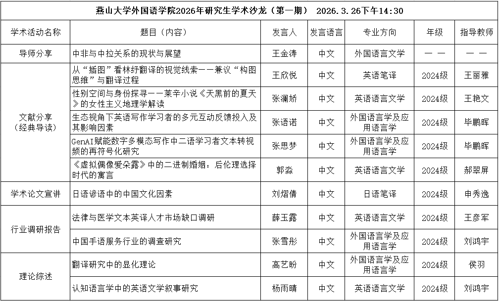 为促进我院研究生学术交流,活跃学术氛围,拓宽学术视野,激励学术创新,我院本年度将继续开展硕士研究生学术沙龙系列活动,沙龙包括“导师分享”、“文献分享(经典导读)”、“学术论文宣讲”、“行业调研报告”、“技术方法推荐”、“理论综述”等六大模块,每期10-15人汇报,采用主题宣讲和师生互动形式进行。现将2026年第一期活动安排公布如下。欢迎各位导师和同学踊跃参加。