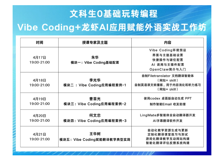 文科生0基础玩转编程:Vibe Coding+龙虾AI应用赋能外语实战工作坊 https://mp.weixin.qq.com/s/b-jajvYMdPD-mAJ_Z0IySA