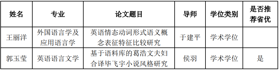 在燕山大学“2023/2024学年度优秀博士硕士学位论文评选”中,我院推荐的两篇硕士学位论文全部评为燕山大学优秀硕士学位论文,其中郭玉莹(导师:侯羽)的学位论文《基于语料库的葛浩文夫妇合译毕飞宇小说风格研究》推荐参评省级优秀论文并成功荣获"河北省优秀硕士学位论文"称号。