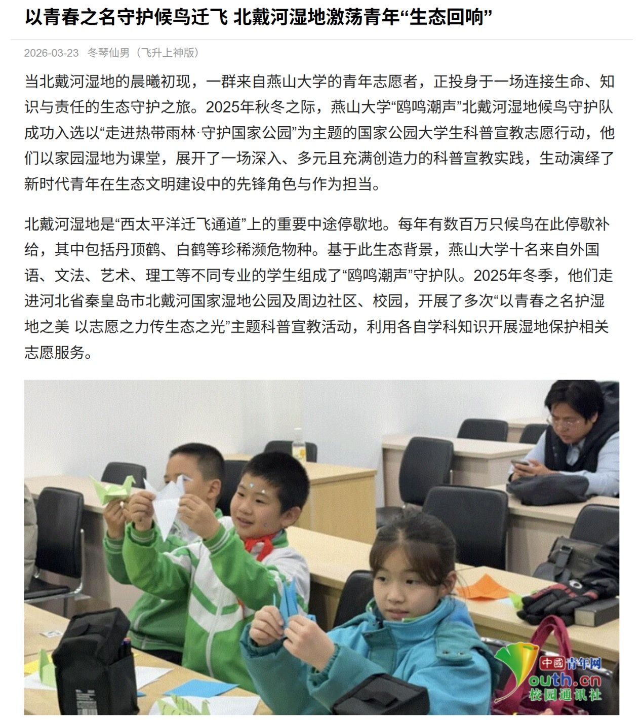 近日,燕山大学“鸥鸣潮声”北戴河湿地候鸟守护队的生态保护实践故事以《以青春之名守护候鸟迁飞 北戴河湿地激荡青年“生态回响”》为题,刊发于中国青年网“中青校园”通讯社栏目。