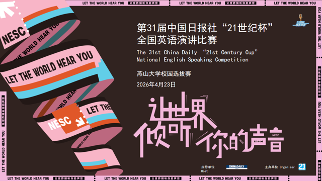 4月23日,由外国语学院承办的“21世纪杯”全国英语演讲比赛燕山大学选拔赛圆满落下帷幕。本次大赛旨在贯彻落实党的二十大精神,提升我校学子英语综合应用能力与跨文化交流素养,引导青年学生讲好中国故事,传播中国声音。