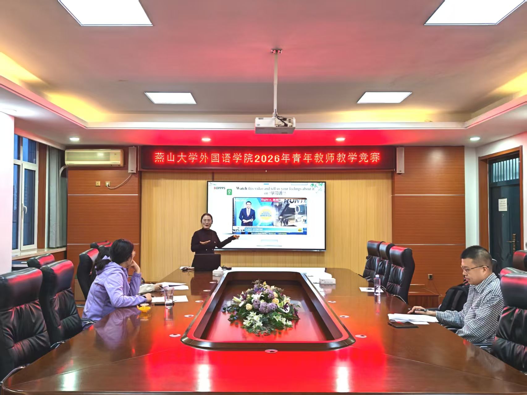 为深入推进青年教师队伍建设,全面提升青年教师教学素养与课堂教学能力,搭建教学经验交流、教学技能切磋的优质平台,助力青年教师专业化成长,4 月 27 日晚,外国语学院 2026 年青年教师教学竞赛在人文馆 417 教室圆满举行。本次竞赛由学院副院长赵志刚主持,学院教学督导、资深教师组成评审组,边雅、姬佳奇、高雅涛、郭梦涵参加了比赛。