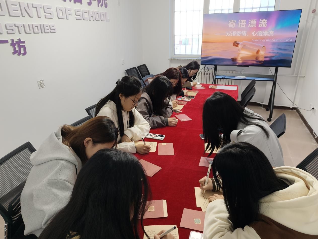 宋冉在“寄语漂流”环节勉励同学们要时刻牢记外语人的身份意识,厚植家国情怀,拓展国际视野,以笔为媒、以语为桥,在双语表达中传递赤诚心声、讲好中国故事。随后,她引导大家现场撰写一封信致十年后的自己,以双语形式呈现。在匿名书写与漂流传递的过程中,同学们将个人理想与时代期许融入字里行间,让心意与家国情怀在双语文字互动中悄然流淌,完成了一次跨越时空的自我对话与精神接力。