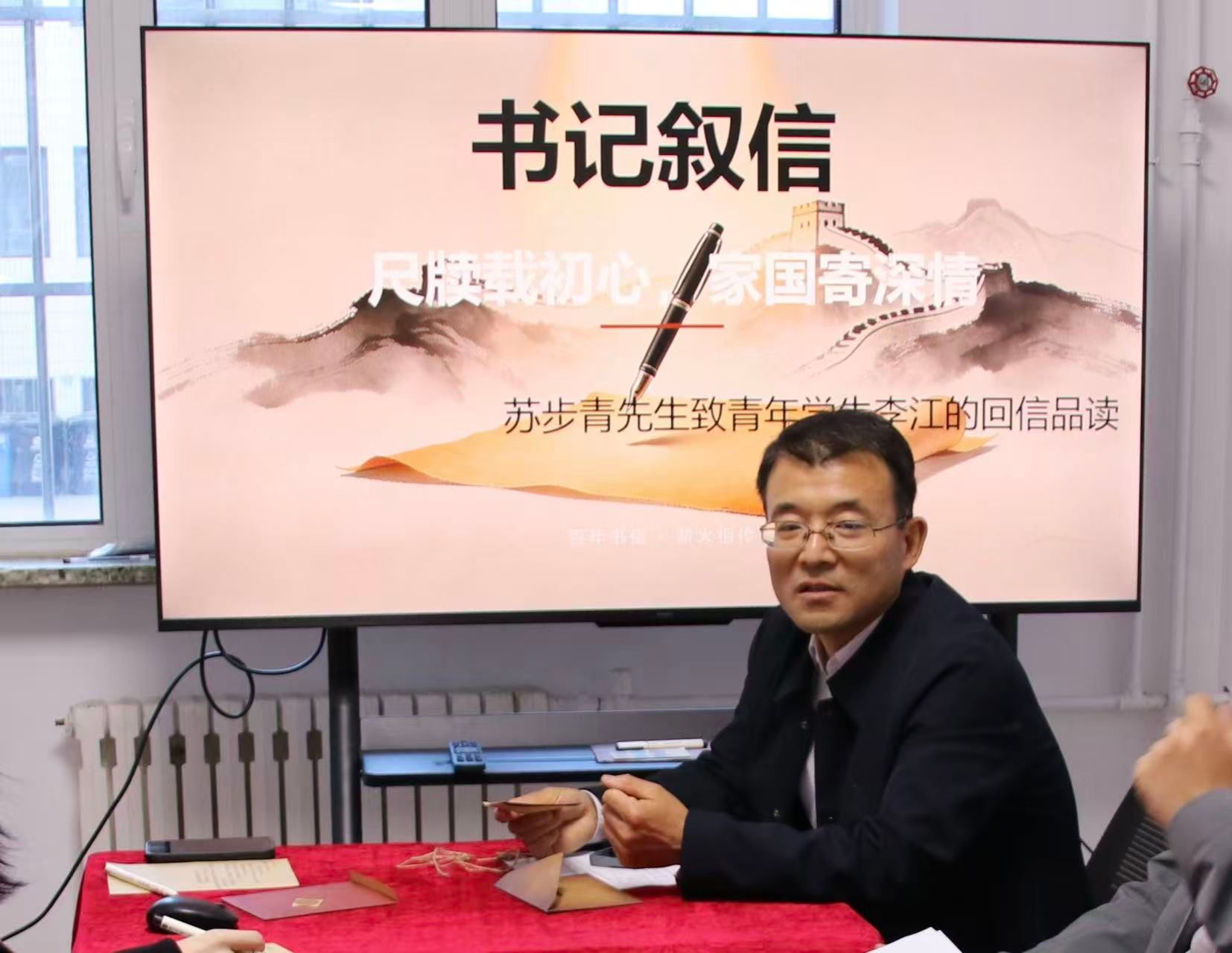 本次活动以书信为媒介,回归纯粹厚重的读信形式,围绕“三封信”展开立体化阅读与研讨。屈晓阳以“书记叙信”开篇,首先诵读了苏步青先生致青年学生李江的回信全文,并结合自身成长经历与工作实践展开分享。他围绕“提升认知站位”、“重构思维格局”、“实现同频共振”三个维度,层层递进地引导同学们:在认知上,透过书信体悟老一辈知识分子的精神高度,增强对家国情怀与时代责任的理解力;在思维上,立足外语学科特色,在跨文化比较中重塑认知框架,实现从知识学习到价值认同的深层转变;在行动上,将个人理想与国家发展紧密相连,让语言能力与国家需要同频共振。