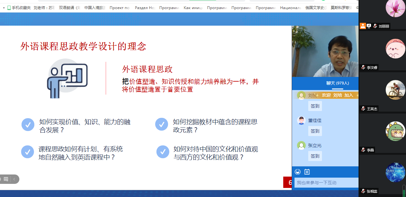 为贯彻落实全国高等学校本科教育工作会议精神,全面推进外语专业“课程思政”教学改革,切实提升我院教师“课程思政”教学能力,2021年5月20日晚,外国语学院组织各系教师参加了由高等教育出版社组织的《2021年外语课程思政教学设计培训会》。