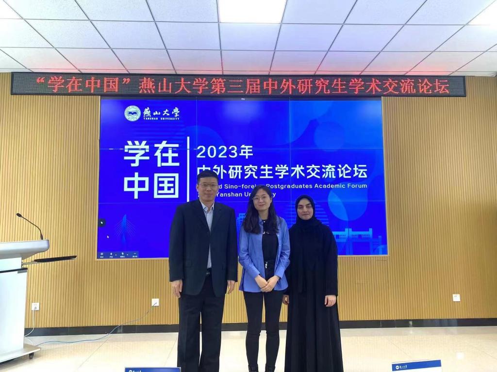 2023年5月12日上午,由燕山大学国际教育学院主办的“学在中国·燕山大学第三届中外研究生学术交流论坛”在西校区第六教学楼一楼报告厅举行。来自学校11个学院近百名中外研究生和研究生导师代表参加了开幕式和分组讨论。我院2021级研究生和浩璇以及留学生美星同学(巴基斯坦)参加了本次论坛。