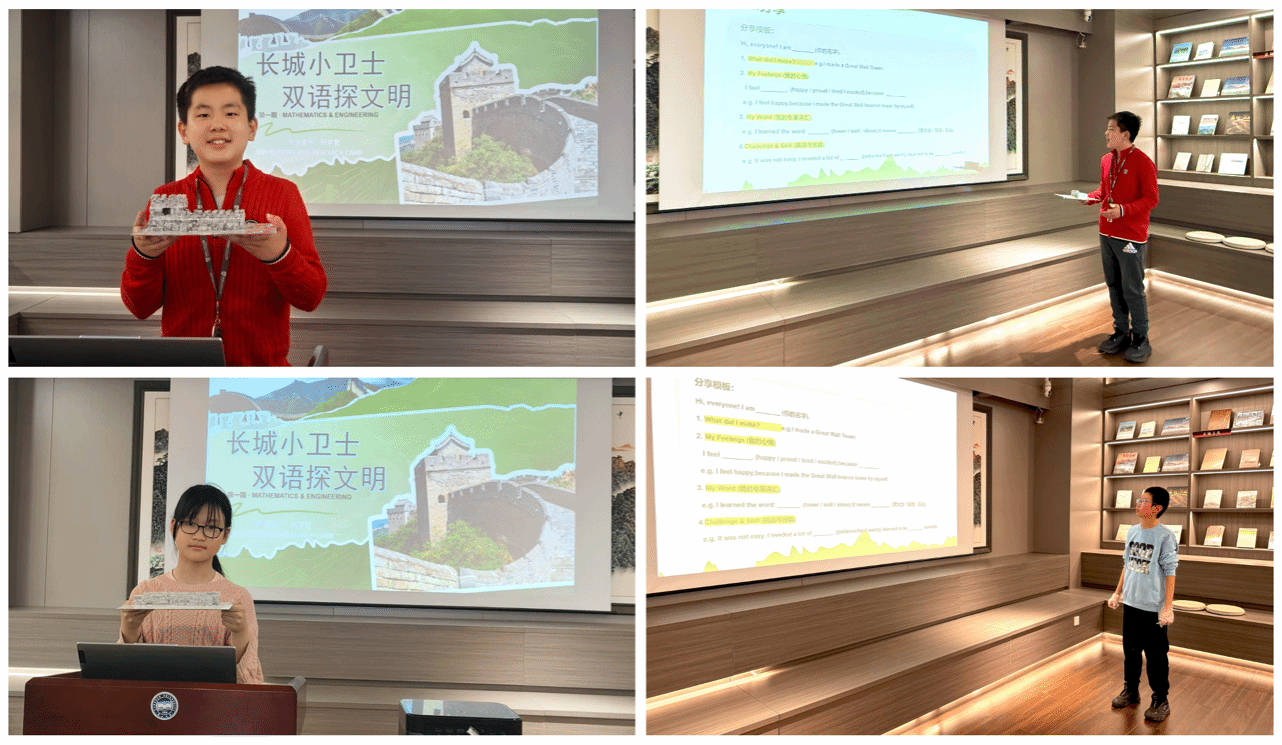 活动尾声,各组代表自信登台,以中英双语流畅分享创作心得与活动收获。展现良好的语言素养与精神风貌。主办方为每位同学颁发“长城文化小使者”纪念徽章,全体人员合影留念,为本次研学画上圆满句号。